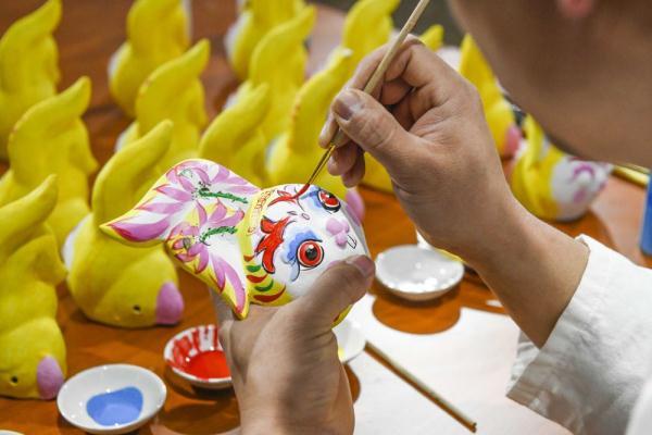 ↑1月16日,河北省玉田县一家泥塑工坊的民间艺人在给生肖兔作品着色。新华社发(刘满仓摄)